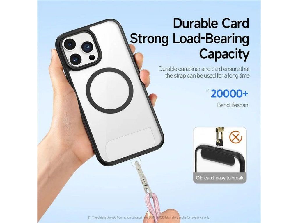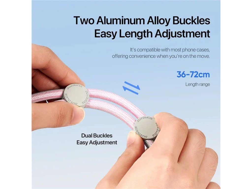 Dvě přezky z hliníkové slitiny zaručují pevné držení a bezpečnost telefonu. Šňůrka DUX DUCIS Plaz vyrobená z vysoce kvalitních materiálů, jako je slitina zinku, TPU a polyester, je odolná proti roztržení a oděru, což zajišťuje dlouhodobé používání.